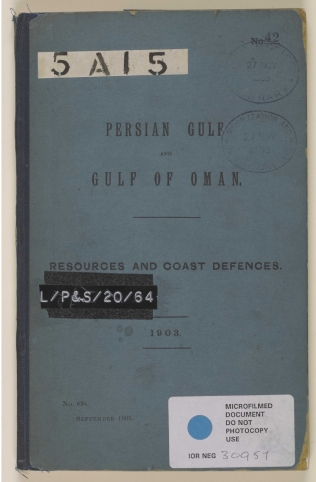 يحتوي الملف على تقرير مطبوع نشرته "الأميرالية، إدارة الاستخبارات (رقم ٦٩٤ ). سبتمبر ١٩٠٣ يجمع المعلومات المتاحة ذات الأهمية البحرية والعسكرية والسياسية عن أماكن متعددة في الخليج العربي وخليج عُمان. ومن بين الأماكن الموصوفة في التقرير مسقط، منطقة مسندم، خور قوي [خور القويع]، خليج إلفينستون [خور الشام]، خصب، ساحل القرصانة [الساحل العربي]، البحرين، الكويت، الفاو، البصرة، المحمرة [خرمشهر]، بوشهر، بندر لنجة، بندر عباس. الكثير من هذه المعلومات مستخلص من مُرشد الخليج الفارسي لسنة ١٨٩٨ . يتضمن التقرير أيضًا "بيان رسمي بالسياسة البريطانية بخصوص: ( ١) سكة حديد بغداد المقترحة؛ ( ٢) بلاد فارس والخليج الفارسي بشكلٍ عام" مُقَدَّم لمجلس الأعيان بالبرلمان البريطاني في ٠٥ مايو ١٩٠٣ ؛ ونصائح حول جمع المعلومات عن الأنظمة الدفاعية مثل المواقع الدفاعية، وحقول الألغام، والمعدات الحربية والأنظمة الدفاعية تحت الماء. يظهر خاتمان يدويان على الغلاف الأمامي وعلى الورقة ٣، يحملان عبارتيّ "مكتبة مكتب الحرب ." البريطاني ٢٧ نوفمبر ١٩٠٣ " و"إدارة التعبئة والاستخبارات، ٢٧ نوفمبر ١٩٠٣ يحتوي المُجلَّد على سبع خرائط.