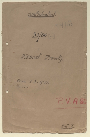 يتكون هذا الملف من مغلف مع وثيقة مختومة تمنح الصلاحيات الكاملة للمقدم السير ترنشارد كرافن ويليام فاول للتفاوض على معاهدة تجارية جديدة مع السلطان سعيد بن تيمور سلطان مسقط وعمان. الوثيقة موقعة من قبل الملك جورج السادس ومختومة بختمه الملكي. وقد طُبع على المغلف: "صلاحيات كاملة للمقدّم السير ترنشارد كرافن ويليام فاول،حامل وسام الامبراطورية الهندية بدرجة قائد فرسان، وحامل وسام الامبراطورية البريطانية بدرجة قائد، للتفاوض مع سلطان مسقط وعمان وتوابعها نيابة عن المملكة المتحدة لبريطانيا العظمى وأيرلندا الشمالية، ونيابة عن الهند أيضاً. الوثيقة تحمل الختم الملكي وموقعة "جورج الملك والامبراطور" تبدأ الوثيقة كما يلي: جورج السادس، بفضل لله، ملك بريطانيا العظمى وأيرلندا والسيادات البريطانية وراء البحار، الملك، المدافع عن الإيمان، إمبراطور الهند ... الخ ولجميع من ستقدم لهم هذه الهدايا فرداً فرداً: تحياتي".
