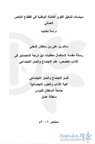 سعت الدراسة نحو القوف الوقوف على أبعاد سياسات تشغيل تشغيل القوى العامة الوطنية في القطاع الخاص العماني ، والتعرف على مدى قدرتها على استعاب الداخلين الجدد إلى سوق العمل، بالإضافة إلى الوقوف على تصورات أطراف عملية العمل (المسئولين بوزارة القوى العاملة، أصحاب الأعمال، العاملين العمانيين) نحو تحقيق أهداف تلك السياسة ، علاوة على الكشف عن أهم الصعوبات التي تواجه تحقيق أهدافها، والتوصل إلى تصورات لتطويرها, وقد اعتمدت الدراسة على المنهج الوصفي التحليلي، مستخدمة طريقتي المسح الاجتماعي، وتحليل المضمون، كمان استندت الدراسة على أربعة أدوات وهي عبارة عن مقياسين لجمع بيانات الدراسة الأمبريقية، قدم الأول للعاملين، وقدم الثاني إلى أصحاب الأعمال، في حين تمثلت الأداة الثالثة في صحيفة مقابلة قدمت للمسؤلين عن وضع سياسات التشغيل، أما الأداة الرابعة فتمثلت في تحليل المضمون الكيفي، وقد خرجت الدراسة بعدة نتائج من أبرزها نجاح سياسات التعمين التي تتبناها الحكومة لتشغيل القوى العاملة الوطنية بالقطاع الخاص، وهناك إقبال من المواطنين العمانيين للعمل في القطاع الخاص، كما تكونت خبرات مهنية لدى العاملين العمانيين في مختلف الأنشطة والمجالات نتيجة عملهم بالقطاع الخاص. وقد قدمت الدراسة مجموعة من التوصيات التي قد تسهم في تطوير سياسات تشغيل القوى العاملة الوطنية في القطاع الخاص من أهمها مقترحات في مجال الأجور والرواتب، والتوجيه والتوعية للقوى العاملة الوطنية، ونظام العمل
