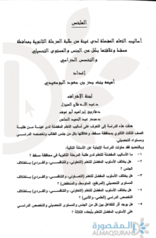 هدفت هذه الدراسة إلى التعرف على أساليب التعلم المفضلة لدى عينة من طلبة الصف الثالث الثانوي بمحافظة مسقط ، وعلاقتها بكل من جنس الطالب وتخصصه الدراسي ومستواه التحصيلي . وبالتحديد فقد حاولت الدراسة الإجابة عن الأسئلة التالية : 1) ما الأساليب المفضلة لدى طلبة المرحلة الثانوية في محافظة مسقط ؟ . 2) هل يخ...