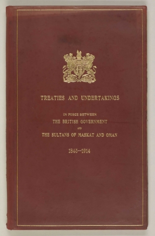 يحمل المجلد الأول عنوان اتفاقيات ومبادرات سارية بين الحكومة البريطانية وسلاطين مسقط و عمان ١٨٤٥_١٩١٤ (وزارة الخارجية والشئون السياسية بحكومة الهند). تشمل الاتفاقيات المسجلة الموضوعات التالية: تجارة العبيد في زنجبار والتلغراف والتجارة والتنازل عن الأراضي وتجارة السلاح ومناجم الفحم بولاية صور. ترد نصوص الاتفاقيات باللغتين الإنجليزية والعربية (والوثائق العربية مرتب من آخر المجلد). تشير ملاحظة موجودة تحت العنوان بالورقة ٤ [الورقة ٤٠ من المجلد الثاني] أنه في حالة وجود أي شك حول التفسير الدقيق لأي جزء من نصوص الاتفاقية، فإن النص المكتوب باللغة الإنجليزية يعتبر حاسمًا. المجلد الثاني هو نسخة إضافية من المستند نفسه. هذا جزء من ملف يحتوي أيضًا على بعض الأوراق المنفصلة. وتتضمن تلك الأخيرة: نص اتفاقية بتاريخ ٢٨ سبتمبر ١٩٢٠ بين حكومة السلطان سعيد بن تيمور بن فيصل، سلطان مسقط وعُمان، والشيخ عيسى بن صالح بن علي الحارثي نيابة عن بعض العُمانيين الموقعين على الاتفاقية؛ خطاب من سعيد بن تيمور إلى المقيم البريطاني في الخليج العربي يقر بتلقيه خطابه الذي يعلمه بتنازل أبيه وتعيينه، باعتباره ولي العهد، كسلطان لمسقط وعُمان؛ نسخة طبق الأصل من الاتفاقية بين المملكة المتحدة والسلطان سعيد بن تيمور بن فيصل، سلطان مسقط وعُمان، بتاريخ ٠٥ فبراير ١٩٣٩ ، والتي حلت محل اتفاقية الصداقة والتجارة والملاحة لعام ١٨٩.