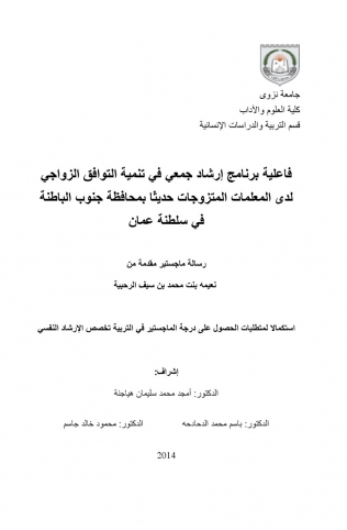 هدفت هذه الدراسة إلى بناء برنامج إرشاد جمعي، وتقصي فاعليته في تنمية التوافق الزواجي لدى المعلمات المتزوجات حديثا بمحافظة جنوب الباطنة في سلطنة عمان، ولتحديد عينة الدراسة قامت الباحثة بتطبيق مقياس التوافق الزواجي الذي تم بناؤه وإعداده لأغراض هذه الدراسة على مجتمع الدراسة المكون من (279) معلمة من المع...